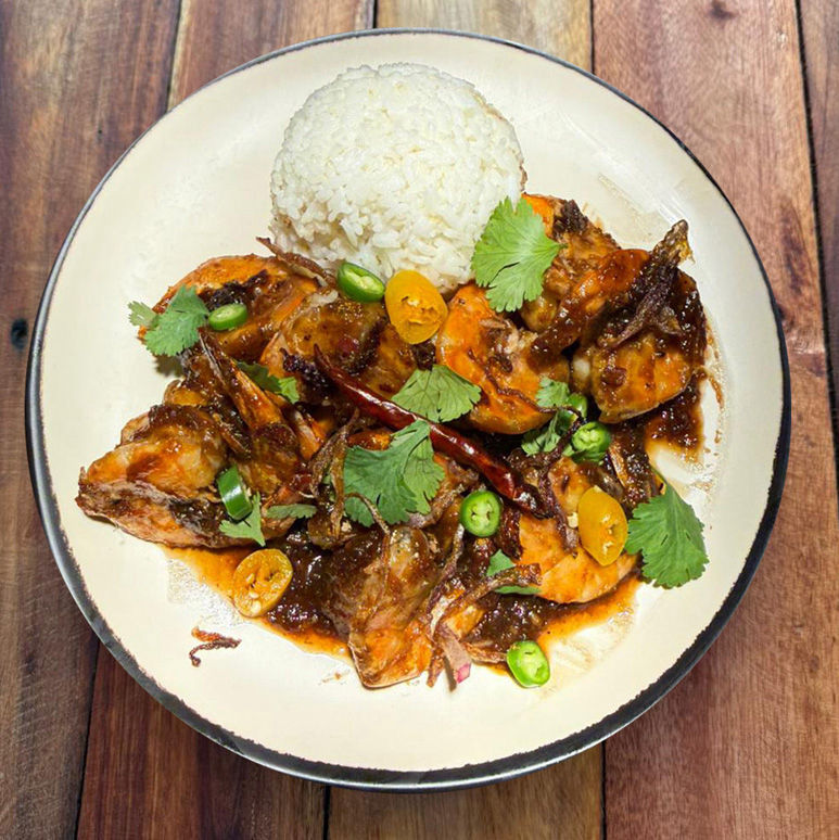Juicy shrimp in a sweet, savory, and spicy tamarind sauce, topped with fried shallots and cilantro. Served with steamed white rice.