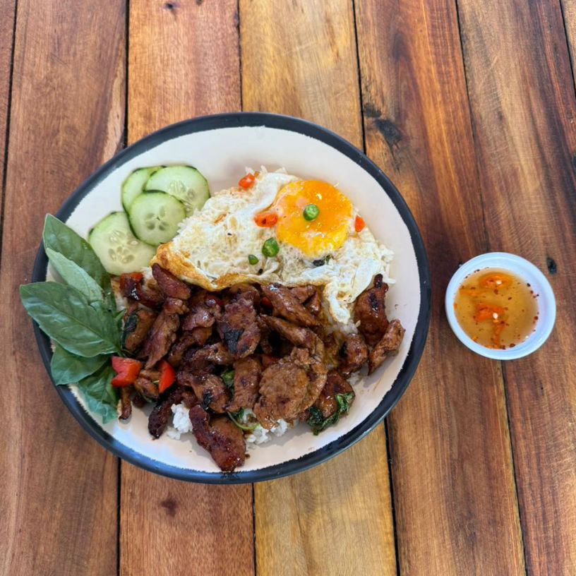 Spicy and aromatic stir-fry with basil served over steamed white rice and topped with a fried egg. Choice of protein: chicken, pork, or mixed.