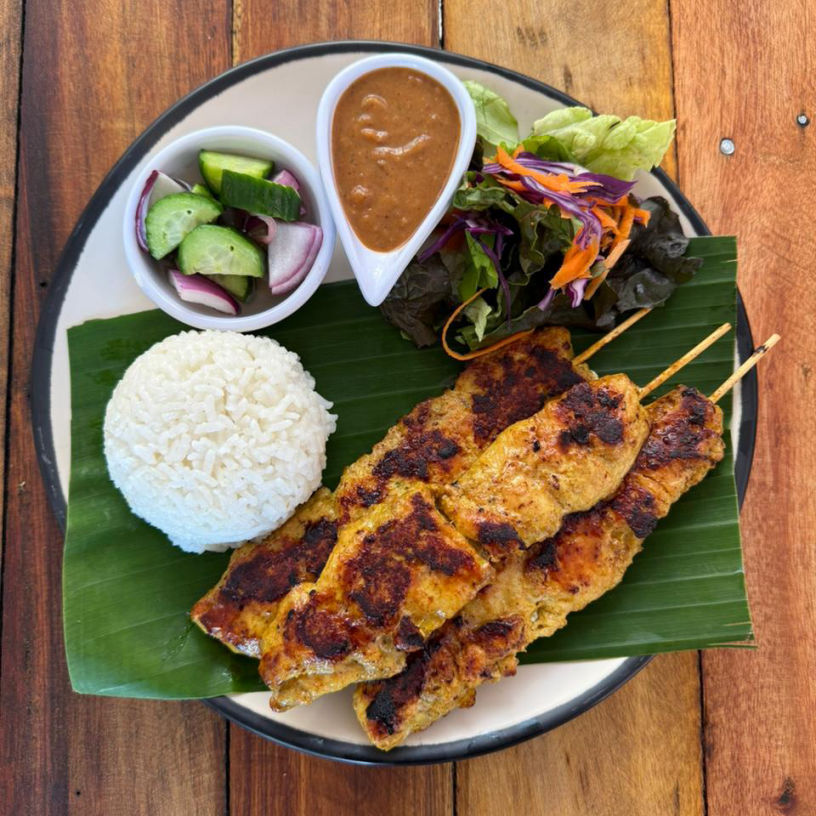 Order of 3 chicken skewers marinated in an aromatic spice blend with coconut milk. Served with white rice, peanut sauce, pickled cucumbers, and salad.