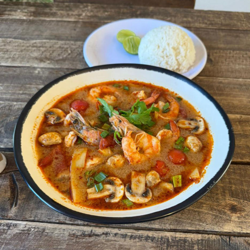 Sweet and sour shrimp soup with an aromatic blend of lemongrass, galangal, kaffir lime leaves, mushrooms, tomato, and shrimp. Garnished with scallions and cilantro, served with steamed white rice.