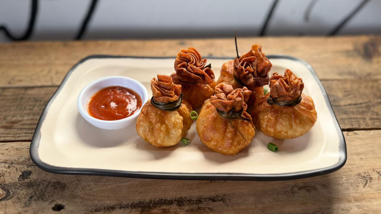 Traditional Thai crispy golden dumpling pouches filled with chicken, shrimp, and shiitake mushrooms.