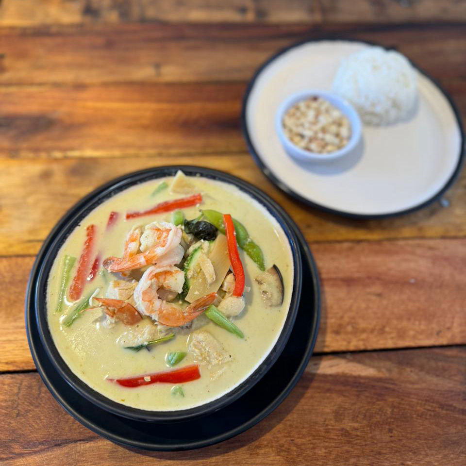 Coconut milk curry with vegetables served with steamed white rice. Choice of protein: