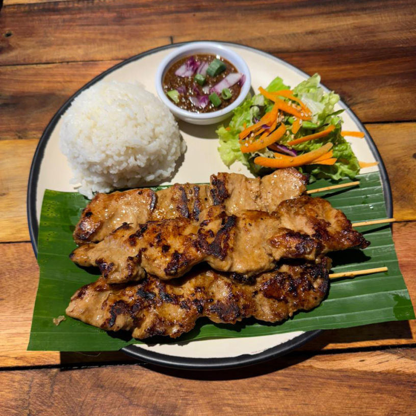Order of 3 grilled pork skewers marinated in a sweet and savory coconut milk sauce. Served with salad, steamed white rice, and sweet-and-sour sauce.